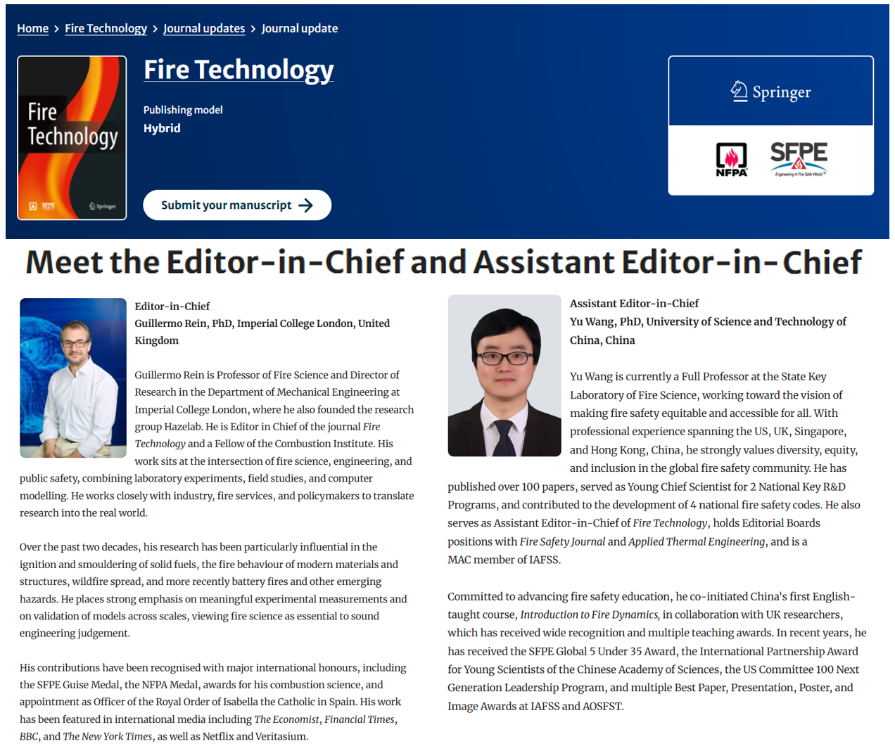 近日,我实验室王禹教授受邀担任Fire Technology助理主编(Assistant Editor-in-Chief)。该期刊由美国消防协会(NFPA)、国际消防工程师学会(SFPE)和Springer Nature联合出版,创刊于1965年,是NFPA和SFPE联合会刊。王禹教授自2023年起担任该期刊副主编,并于2026年1月正式担任期刊助理主编,这也是该期刊首次设置该重要学术职位。